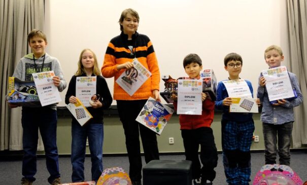 Šachový spolek Újezd nad Lesy pořádá dětský rapidový turnaj jednou ročně a společenská laťka je nastavena vysoko. V újezdském DDM je krásně a takové pohoštění, jaké kluboví rodiče a příznivci pro hráče a hosty chystají, to se vidí málokde. Partie se hrály v rychlém tempu 2×10 min+5 s/tah, kol bylo sedm, online šachovnice s přenosem na lichess.org jedna (letos poprvé). Hráčů dorazilo 56, většina z Újezda a sousedních Říčan, Čelákovic a Úval, místní 10letý mistr Čech Gabriel Mallein bohužel onemocněl. Objevil se ale 8letý mistr Čech Madi Baltynov a bral vše, ze 7 kol získal 6,5 bodů. Druhé místo patřilo zaslouženě staršímu žáku Janu Kmentovi, porazil až na vítěze všechny, a třetí místo zabralo něžné pohlaví – Klára Hanyková. Borci Unichessu Antonio Landeros a Štěpán Hanyk obsadili 2. a 3. místo v mladších žácích. Oba se potkali v předposledním kole a Antoniova odvážná rošáda v 35. tahu pobavila všechny přihlížející, i Antonia. (Hanyk-Landeros, 1.e4 c5 2.Nf3 d6 3.d4 cxd4 4.Nxd4 Nf6 5.Nc3 a6 6.Bc4 e6 7.Bb3 Be7 8.f3 Bd7 9.Be3 Nc6 10.Qd2 Na5 11.O-O-O Nxb3+ 12.Nxb3 b5 13.h4 a5 14.h5 a4 15.Nd4 b4 16.Nce2 b3 17.a3 bxc2 18.Rdg1 Rb8 19.g4 Qb6 20.Qxc2 Rc8 21.Nc3 Qc7 22.g5 Ng8 23.g6 fxg6 24.hxg6 h6 25.Qh2 e5 26.Ne2 Bb5 27.Kb1 Bxe2 28.Qxe2 Qc6 29.Nd5 Nf6 30.Rc1 Qb7 31.Rxc8+ Qxc8 32.Qb5+ Qd7 33.Qb8+ Bd8 34.Nxf6+ gxf6 35.Rxh6 O-O 36.Qb4 Be7 37.Qd2 Rd8 38.Qh2 Kg7 39.Rh7+ Kxg6 40.Qh5#) Újezde, velký dík a za rok na viděnou!